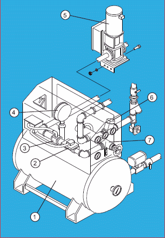 Pressurized water is piped from the pressure reserve tank (1) to the desired locations within your plant. As this water is used, pressure within the reserve tank drops.